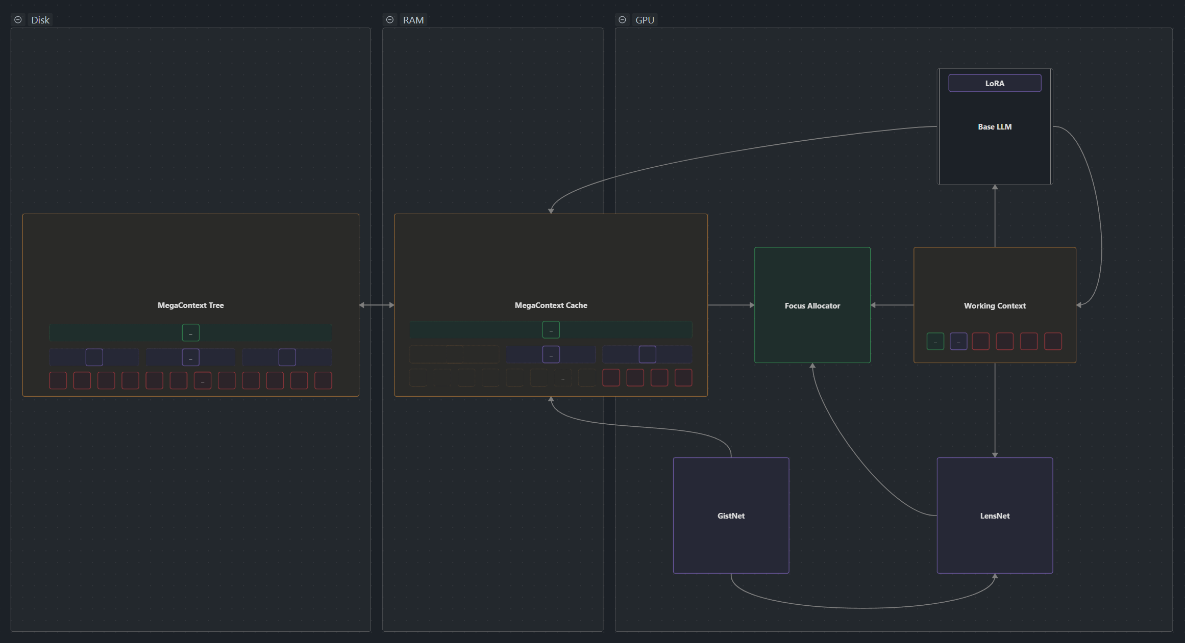 MegaContext virtualizes context by pairing a disk-backed gist tree called the MegaContext Tree with a budgeted working context governed by GistNet, LensNet, and the Focus Allocator. This two-context architecture (1) separates concerns between long-term storage and active processing.