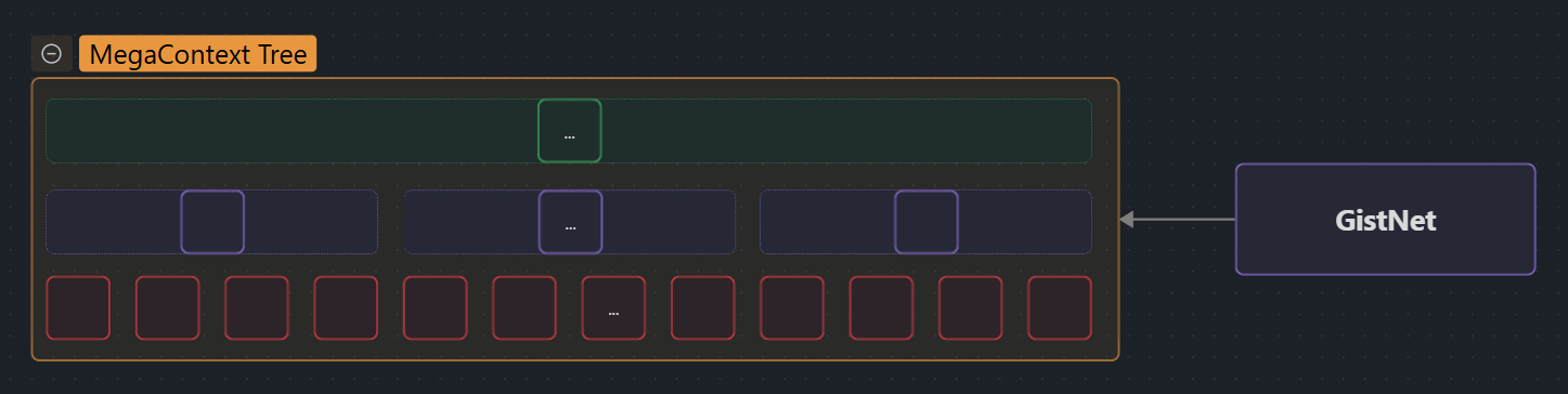 The MegaContext Tree is a hierarchical data structure that stores the complete interaction or document history as a tree of gists. Unlike traditional LLM context windows that are limited to a fixed size, the MegaContext Tree can grow unboundedly while providing different levels of detail on demand.